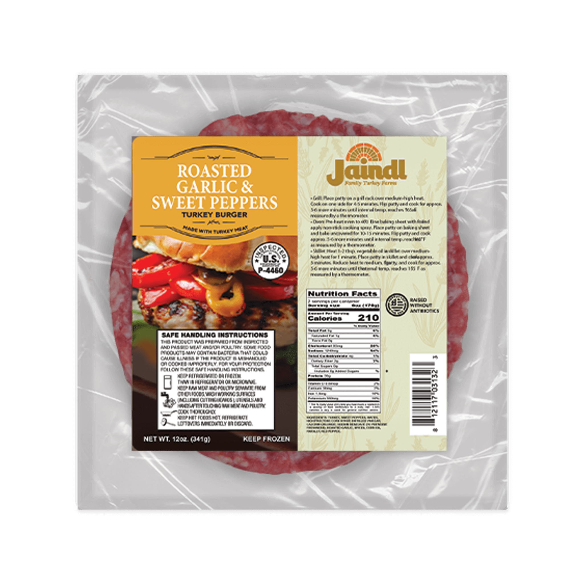 Savor bold, savory flavor with Jaindl Roasted Garlic & Sweet Peppers Premium Frozen Turkey Burgers—crafted with clean, wholesome ingredients for a delicious and nutritious meal option. Made from Jaindl’s premium turkey meat, these burgers are infused with roasted garlic and sweet peppers for a rich, gourmet taste without artificial additives.